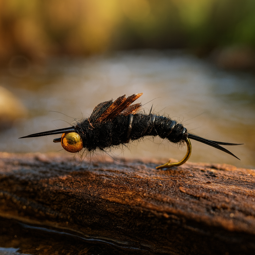 Material: Black Dubbing, Beadhead, Rubber Legs, Thread, Hook